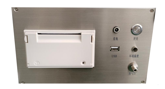 背面由充電口、開關(guān)鍵、USB接口、環(huán)境溫度、出氣口、微型針式打印機組成。