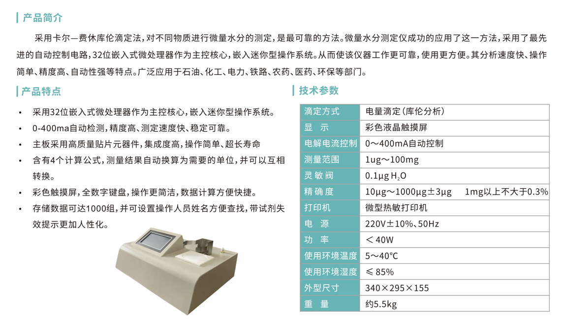 采用卡爾一費(fèi)休庫倫滴定法,對不同物質(zhì)進(jìn)行微量水分的測定,是最可靠的方法。微量水分測定儀成功的應(yīng)用了這一方法,采用了最先