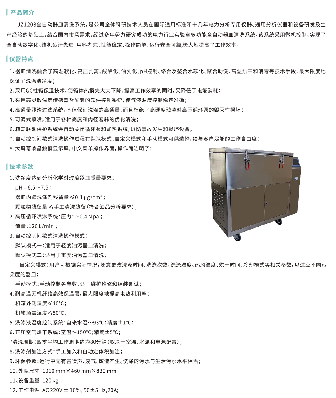 JZ1208全自動(dòng)器皿清洗系統(tǒng),是公司全體科研技術(shù)人員在國(guó)際通用標(biāo)準(zhǔn)和十幾年電力分析專(zhuān)用儀器、通用分析儀器和設(shè)備研發(fā)及生