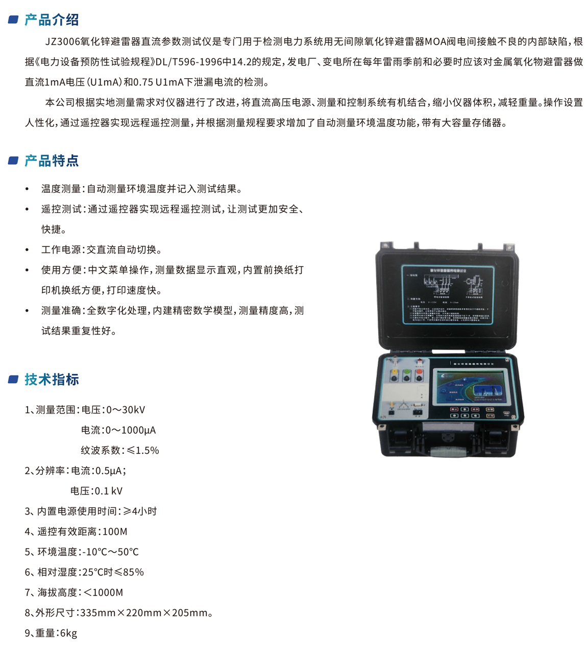 JZ3006氧化鋅避雷器直流參數(shù)測(cè)試儀是專門用于檢測(cè)電力系統(tǒng)用無間隙氧化鋅避雷器MOA閥電間接觸不良的內(nèi)部缺陷,根