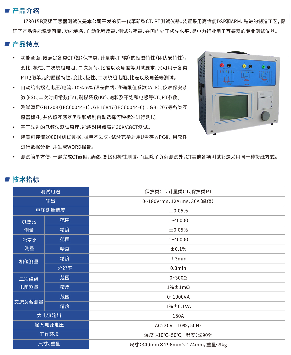 JZ3015B變頻互感器測試儀是本公司開發(fā)的新一代革新型CT、PT測試儀器。裝置采用高性能DSP和ARM、先進的制造工藝,保 證了產(chǎn)品性能穩(wěn)定可靠、功能完備、自動化程度高、測試效率高、在國內(nèi)處于領(lǐng)先水平,是電力行業(yè)用于互感器的專業(yè)測試儀器。