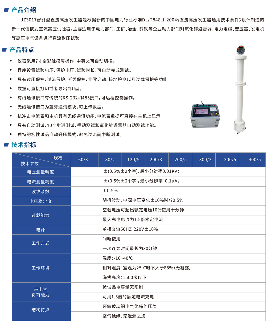 JZ3017智能型直流高壓發(fā)生器是根據(jù)新的中國電力行業(yè)標(biāo)準(zhǔn)DL/T848.1-2004《直流高壓發(fā)生器通用技術(shù)條件》設(shè)計制造的