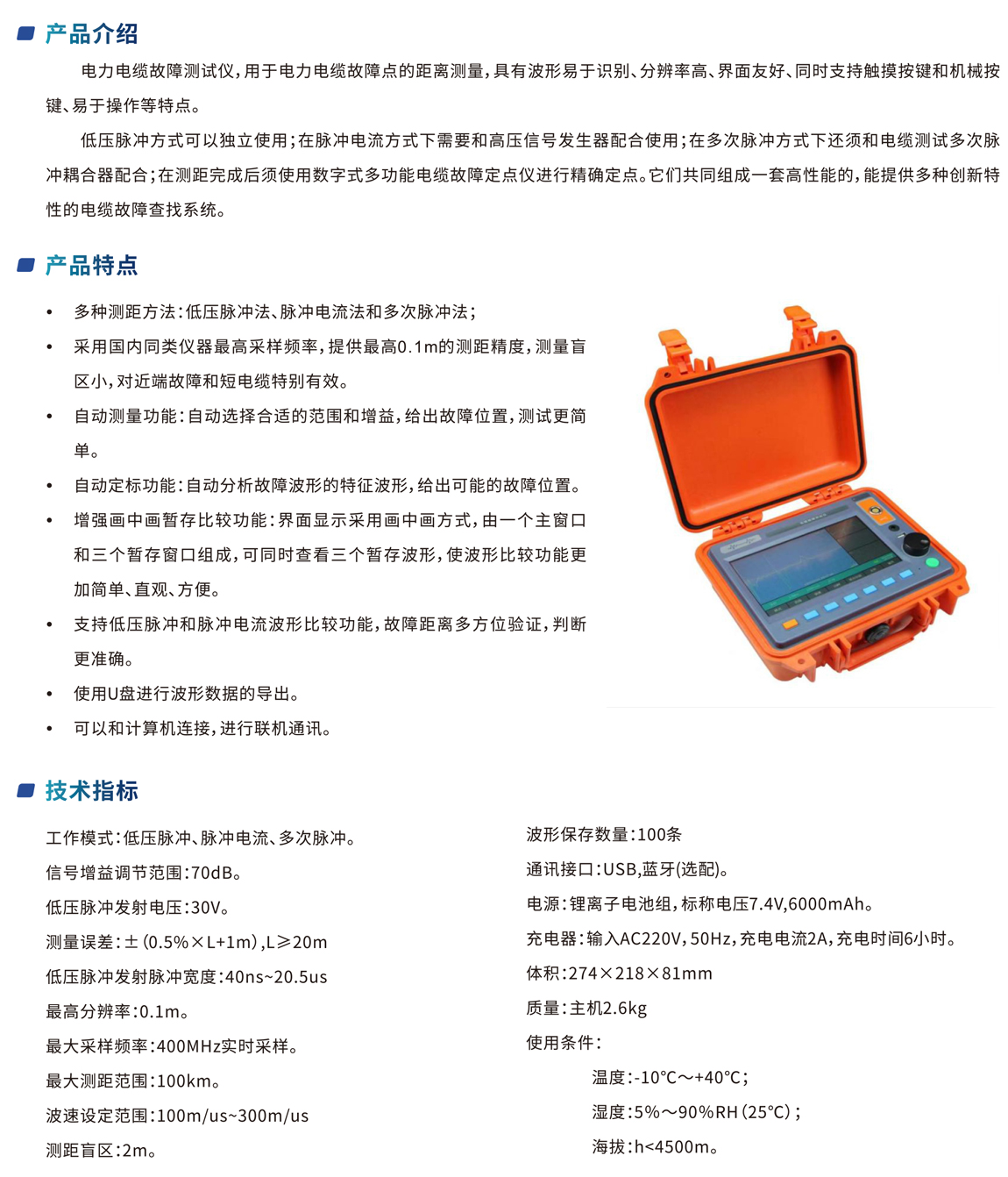 電力電纜故障測試儀,用于電力電纜故障點的距離測量,具有波形易于識別、分辨率高、界面友好、同時支持觸摸按鍵和機(jī)械按 鍵、易于操作等特點。