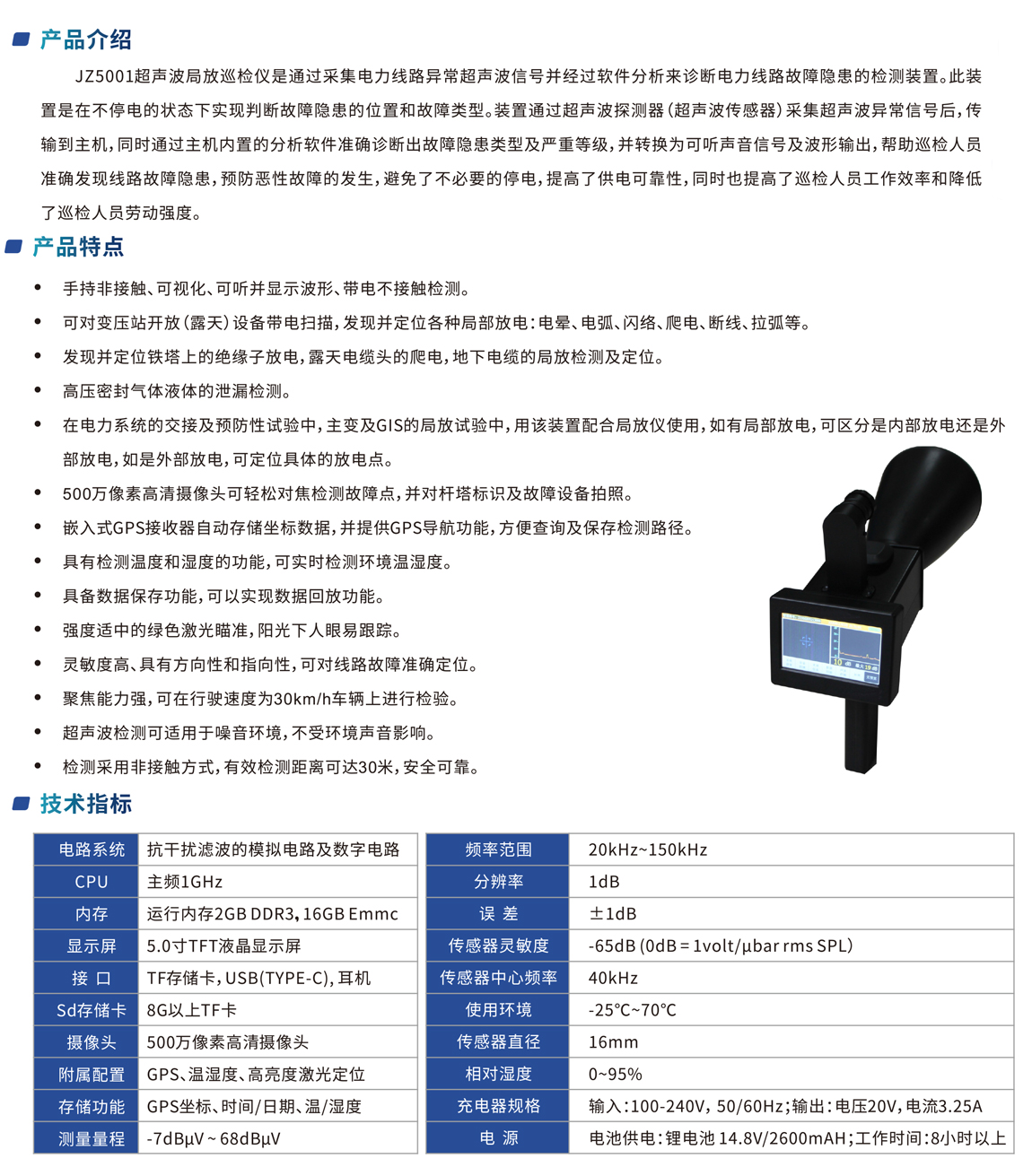JZ5001超聲波局放巡檢儀是通過采集電力線路異常超聲波信號并經(jīng)過軟件分析來診斷電力線路故障隱患的檢測裝置。此裝