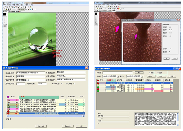憎水等級判斷分為兩部分:主觀判斷和客觀判斷。用戶還可以利用“查詢”功能,對歷史判斷記錄進(jìn)行檢索、查詢和統(tǒng)計(jì)分析。